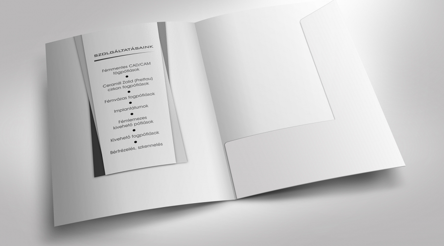 A Dental Tech egy fogtechnikai laboratorium. Arra kértek, hogy tervezzünk számukra dossziékat, pólókat, illetve többpéldányos, tömbösített önátírós munkalapokat mindennapi használatra. A kiindulási alapot a már meglévő weboldaluk adta. A grafikai terveket úgy alakítottuk ki, hogy illeszkedjen a weboldal és a céglogó színvilágához, stílusához.